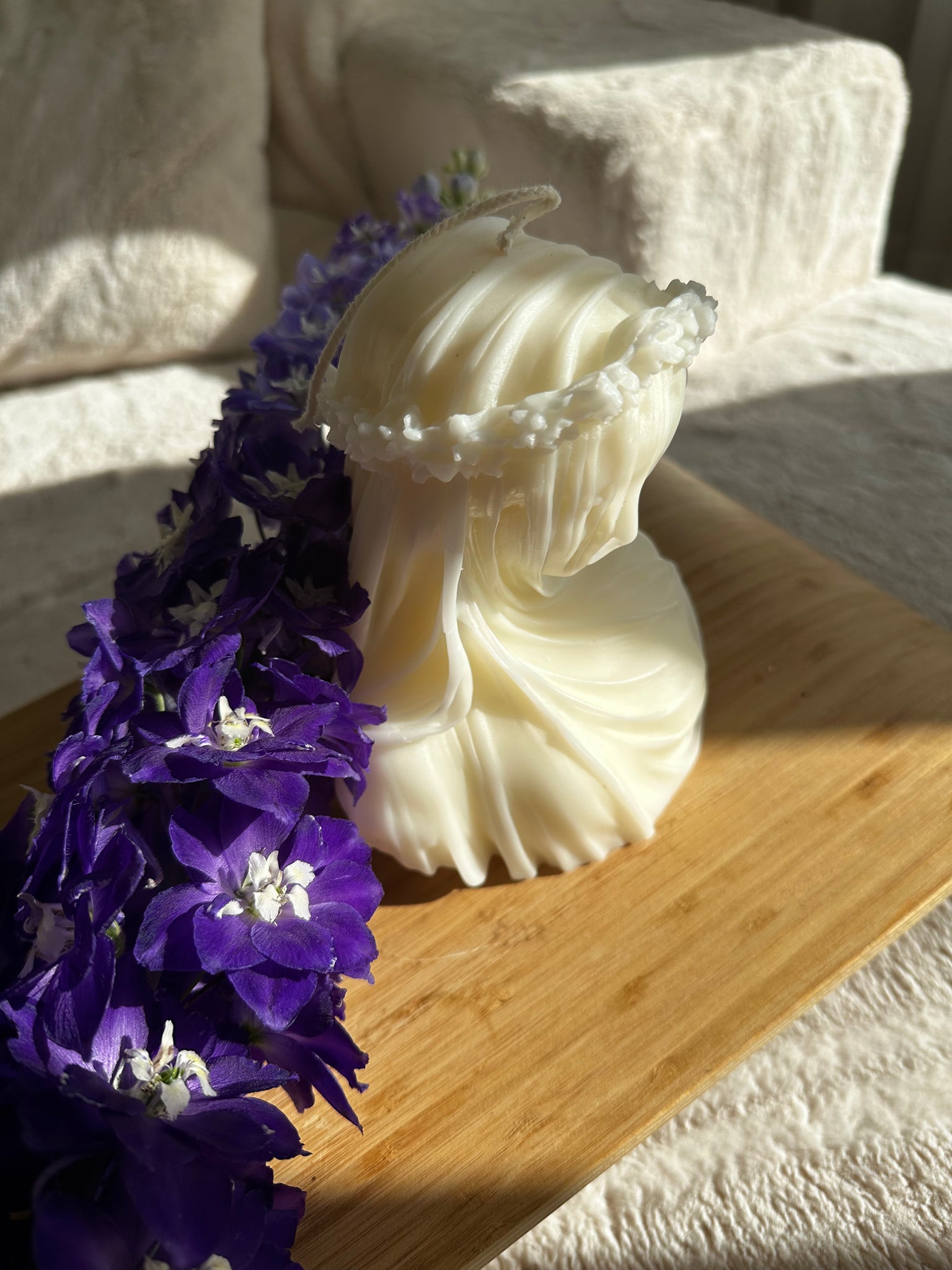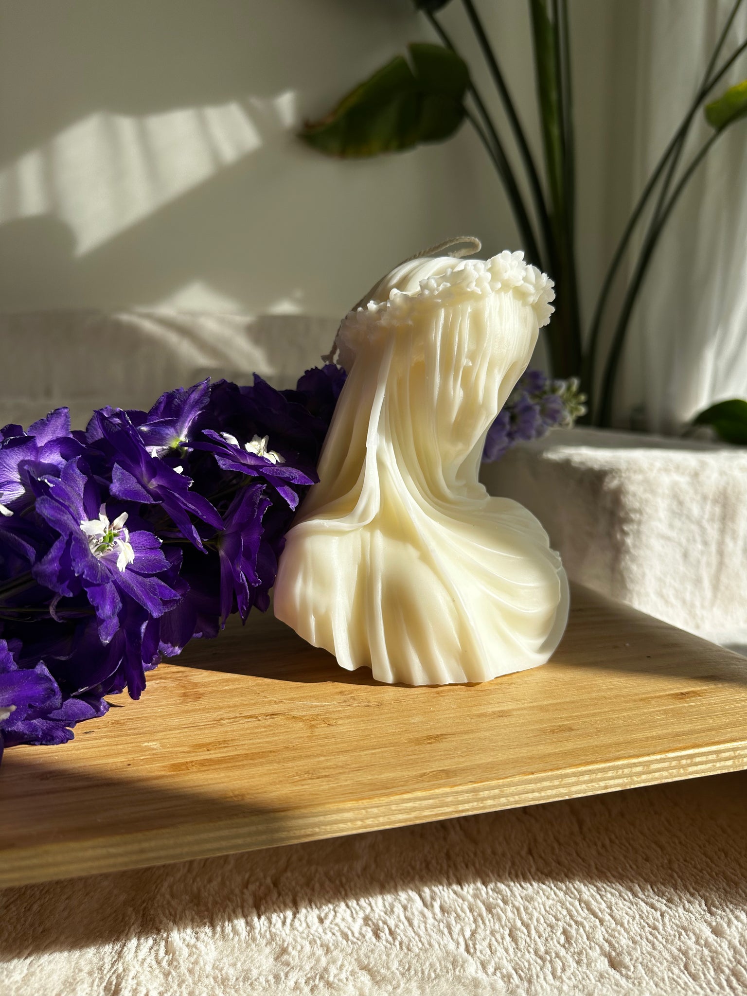 Inspired by the Italian artist Rafael Monti (1818 -1881 ) and often referred to as the Veiled Bride. She portrays a young lady with a veil falling gently over her face held in place by a floral headdress. This candle is not only serene but also quite mysterious, and it gives a dramatic aura in-home or office. Perfect for gifts and your home design.